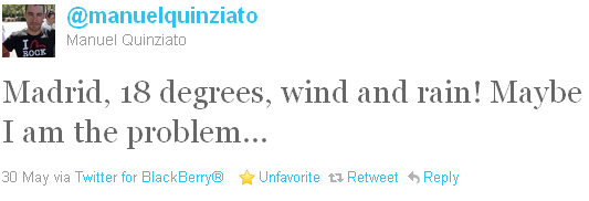 Het probleem waar wielrenners (inclusief "zondagsrenners") regelmatig mee te maken hebben is het feit dat deze sport buiten beoefend wordt en we dus afhankelijk zijn van de weersomstandigheden. Voor profwielrenners is dat ook niet altijd een pretje want de planning van hun trainingen en wedstrijden houden geen rekening met het weer!Manuel Quinziato (BMC Racing Team) is dusdanig teleurgesteld door het weer dat hij begint te denken dat het aan hem ligt wanneer hij aankomt in Madrid en het ook in de Spaanse stad geen lekker weer is ...