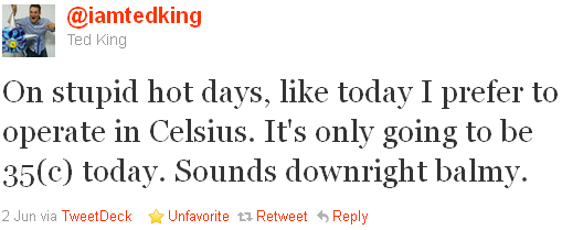 Voor Ted King (Team Liquigas-Cannondale) is het probleem juist andersom: voor hem is de temperatuur zo hoog opgelopen dat hij ze liever in Celcius dan in Fahrenheit uitdrukt! Logisch als je weet dat de temperatuur in °C gelijk is aan die in (°F − 32) × 5⁄9.