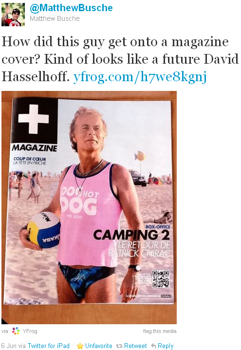 Matthew Busche, die onlangs Amerikaans kampioen werd en op dit moment in Frankrijk is ontdekte onlangs Canal+ Magazine met op de kaft een foto van de film Camping ... hij vraagt zich af wat hij op de kaft doet en vergelijkt Frank Dubosc met David Hasselhoff!