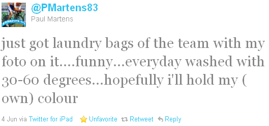 Bij Rabobank hebben alle renners en staffleden nieuwe waszakken gekregen. Het bijzondere daaraan is dat de naam en foto van de eigenaar de zak persoonlijk maakt. Hiermee is het vast stukken makkelijker om te weten aan wie welke zak toebehoort!Als de zak echter te warm gewassen wordt zou Paul Martens zomaar eens van kleur kunnen verschieten! Het lijkt mij dat hier een markt is voor een wasmiddelenfabrikant!
