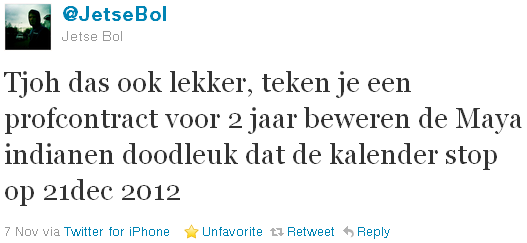 Volgens Jetse Bol (in 2012 neoprof bij Rabobank) zouden de Maya's het einde van de wereld hebben aangekondigd voor 21 december 2012 ... En dat stelt hij blijkbaar niet echt op prijs want hij heeft net een profcontract van 2 jaar getekend!