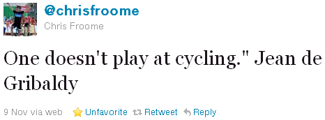 Halverwege de week plaatste Chris Froome, de Zuid-Afrikaanse renner van Team Sky die normaal gesproken zijn ongelofelijke avonturen aan zijn ploegmaten vertelt, een citaat van Jean de Gribaldy, een voormalig Frans wielrenner (uit de jaren '40/'50).