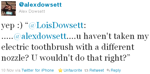 Een andere terugkomer in de Tweets van de week is Alex Dowsett van Team Sky. Vorige week had hij al problemen met zijn zus vanwege de shampoo, deze week heeft hij blijkbaar haar elektrische tandenborstel gebruikt ...