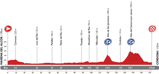 Een vrijwel volledig vlakke etappe voor deze 4de etappe, in ieder geval voor de eerste 115 kilometers. Na de start in Mairena del Alcor is het parcours vrijwel volledig vlak, tot aan de Alto de San Jerónimo (3de categorie) en met de beklimming van de Alto del Catorce por ciento (die een gemiddeld stijgingspercentage moet hebben van 14% als we af kunnen gaan op de naam en die ook op het programma stond voor de finish in Córdoba in 2009 toen de etappe werd gewonnen door Lars Boom) is de kans groot dat een klein groepje of een renner alleen als eerste aan de finish komt in Córdoba!