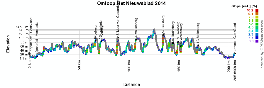 From there they'll go back south to Brakel where they'll climb the Leberg for the second time [again 950 m - 4.2% (max 13.8%)], then continuing a bit back north and start the trip eastwards via the Molenberg in Zwalm [463 m - 7% (max 14.2%) - of which 300 m are cobbles]. From there, they'll go back north towards Ghent where the finish will also take place on the Sint-Pietersplein.