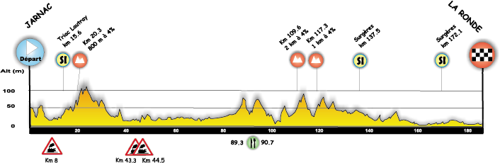 Après le départ depuis la Place Charles De Gaulle à Jarnac, les coureurs effectuent une boucle autour de la ville de départ, en passant par le sprint intermédiaire de Bourras et le premier meilleur grimpeur (800 m à 4%).Une fois de retour à Jarnac, ils tournent vers l'ouest et passent dans la zone de ravitaillement entre Sainte-Même et Le Puits d'Asnières. Après avoir contourné Saint-Jean-d'Angély ils accèdent au deuxième meilleur grimpeur (1 km à 4%), avant de se diriger vers le sprint intermédiaire de Surgères.