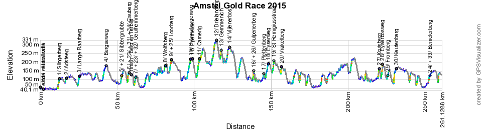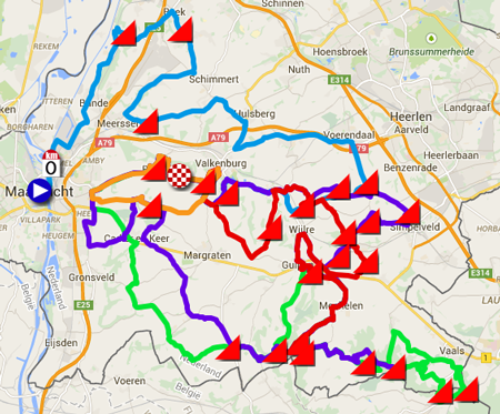The Amstel Gold Race 2015 race route - for its 50th edition! - is a bit different from last year but the race still includes 34 climbs for this UCI WorldTour race (in 2011 the number of climbs went up from 31 to 32 and in 2012 again down to 31, before going up to 34 in 2013). In this article you'll find the time- and route schedule and the race route on Google Maps and you can also download the race route in Google Earth for example if you want to do a virtual fly-over.