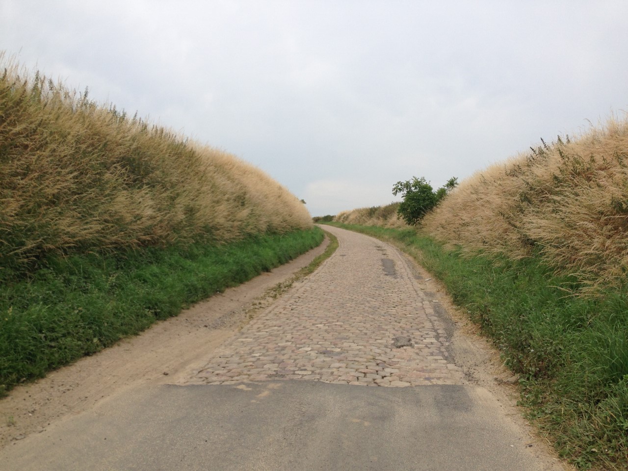 puis pavé légèrement bombé avec la terre sur le haut du pavé qui rend la trajectoire à privilégier car beaucoup plus roulante