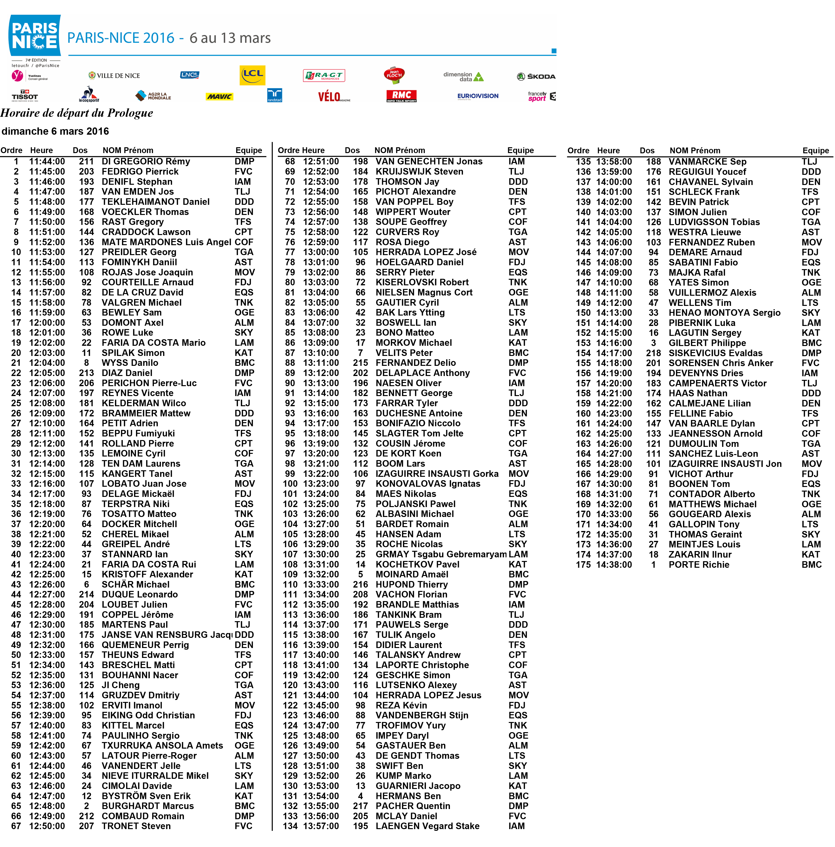 De startvolgorde en -tijden van de proloog van Parijs-Nice 2016 (Conflans-Sainte-Honorine, zondag 6 maart 2016)