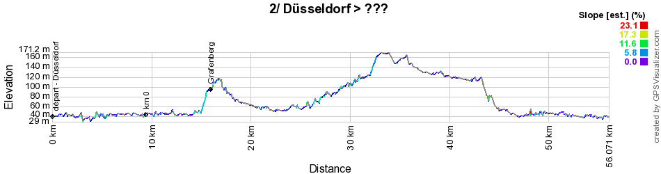You'll find below the profile of the first part of this second stage (up to the point where they come back to Düsseldorf), as well as the detailed race route on Google Maps. Click on each of the images to open them.