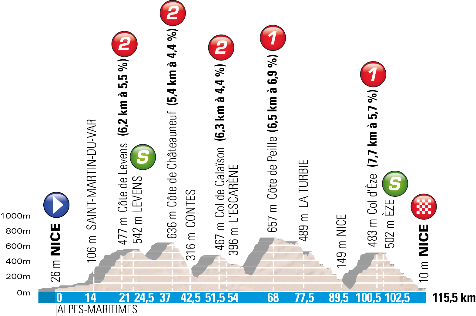 A short stage with start and finish in Nice will end off the 75th edition of Paris-Nice. 115.5 kilometers full of no less than 5 climbs with the Côte de Levens (2nd category, 6.2 km @ 5.5%) which will be followed by the intermediate sprint in Levens, the Côte de Châteauneuf (2nd category, 5.4 km @ 4.4%) followed a bit further by the Col de Calaïson (2nd category, 6.3 km @ 4.4%).There will still be two 1st category climbs at the programme, first of all with the Côte de Peille (6.5 km @ 6.9%) and after a long descent the climb of the usual Col d'Eze (7.7 km @ 5.7%) (followed by the sprint in Eze) which has its summit at 15 kilometers from the finish line which will this time thus not be drawn on the Promenade des Anglais but on the Quai des Etats-Unis, still at the seaside.